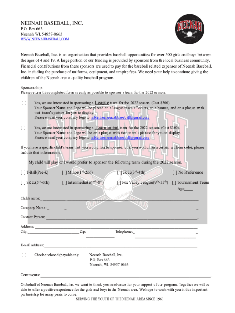 Fill out the forms with accurate information about Neenah Baseball Inc.