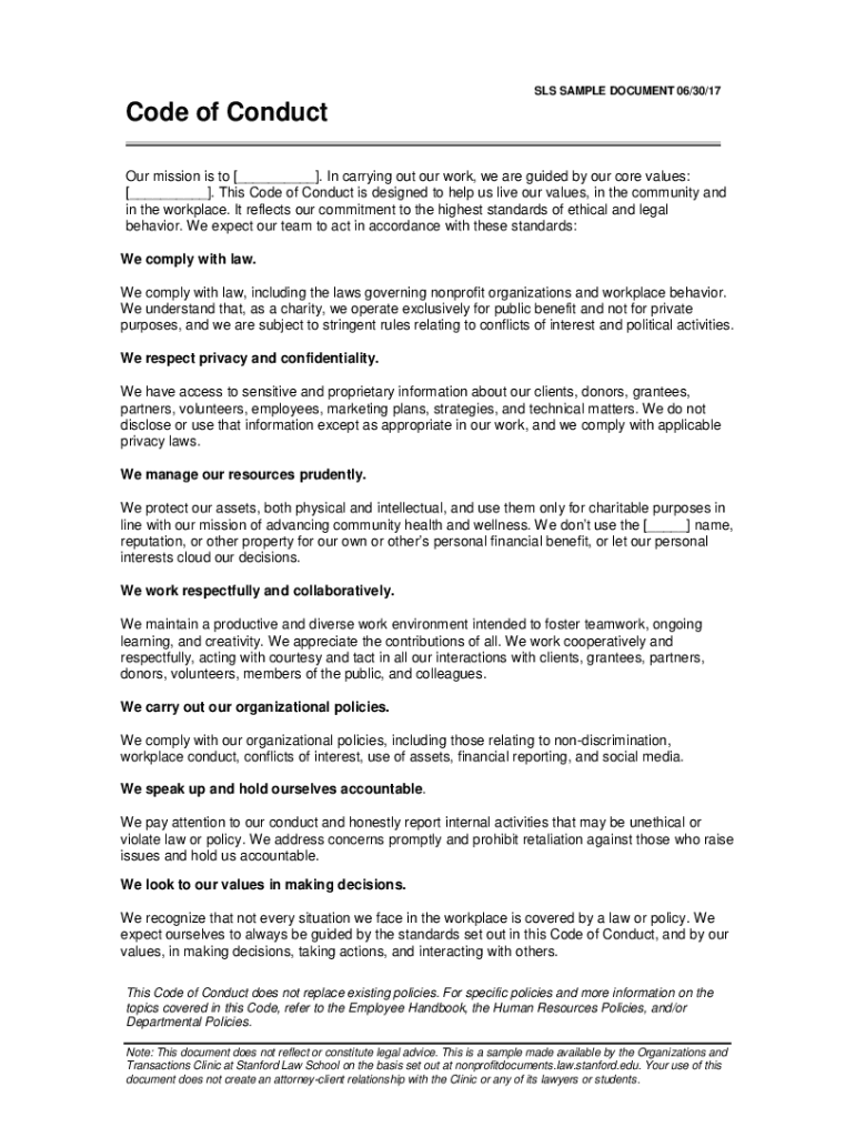 SLS SAMPLE DOCUMENT 06/30/17Code of Conduct Our mission is to [___]. In carrying out our work, we are guided by our core values: [___]. This Code of Conduct is designed to help us live our values,