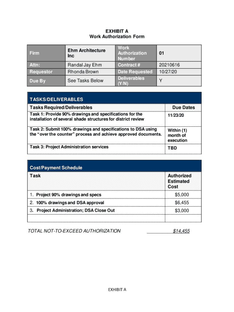 Exhibit A work authorization is a document that authorizes an individual to work in a specific capacity or position.