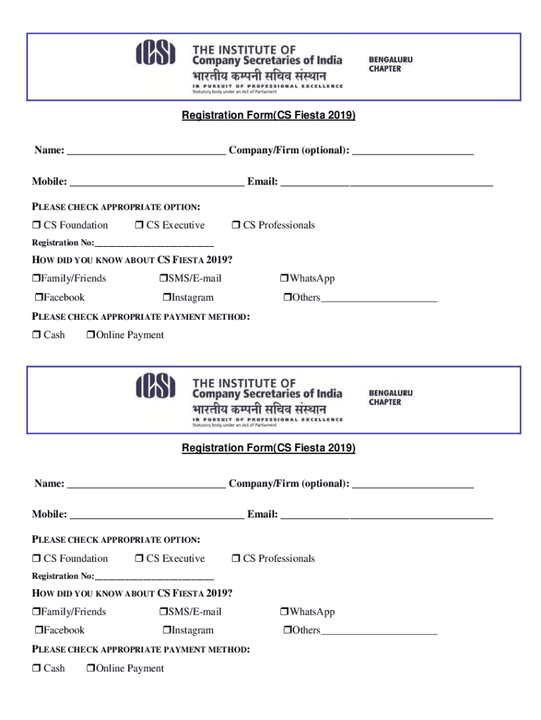 Registration Form(CS Fiesta 2019) Name: ___ Company/Firm (optional): ___ Mobile: ___ Email: ___ PLEASE CHECK APPROPRIATE OPTION: CS Foundation CS Executive CS ProfessionalsRegistration No:___HOW DID
