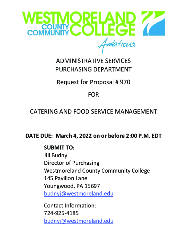 ADMINISTRATIVE SERVICES PURCHASING DEPARTMENT Request for Proposal # 970 FOR CATERING AND FOOD SERVICE MANAGEMENT DATE DUE: March 4, 2022, on or before 2:00 P.M. EDT SUBMIT TO: Jill Buddy Director