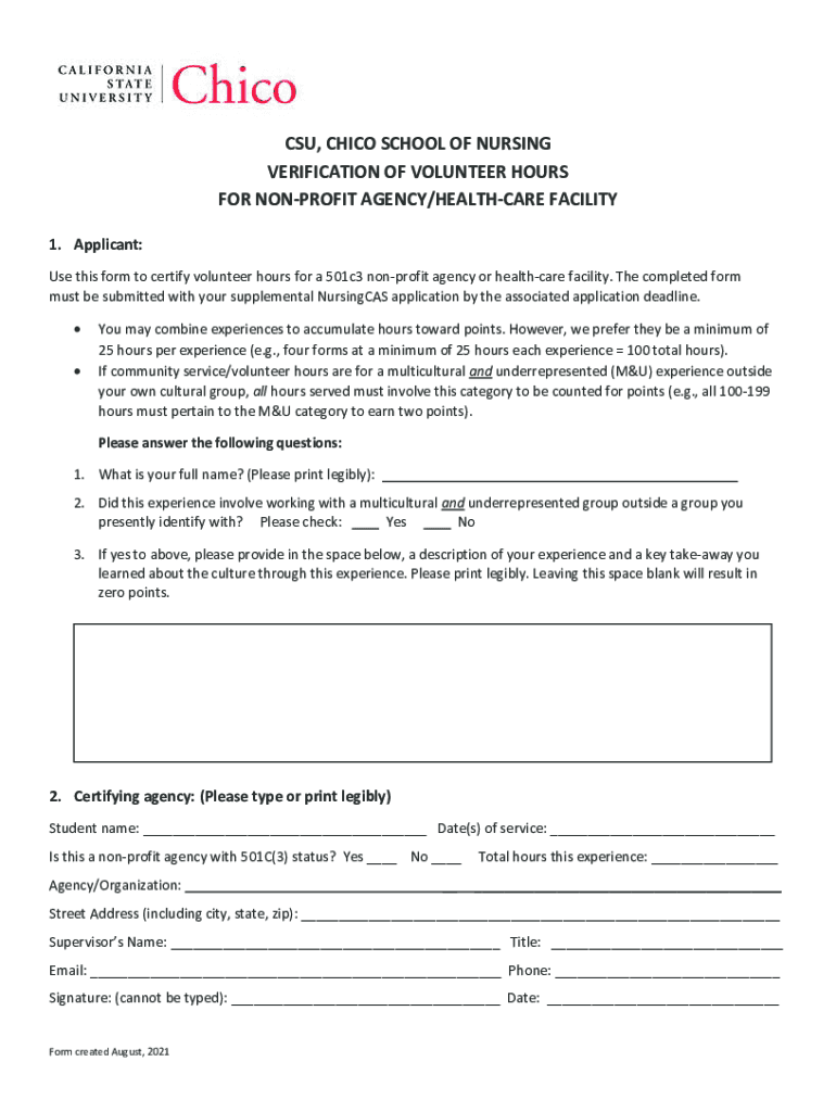 CSU, CHICO SCHOOL OF NURSING VERIFICATION OF VOLUNTEER HOURS FOR NONPROFIT AGENCY/HEALTHCARE FACILITY 1. Applicant: Use this form to certify volunteer hours for a 501c3 nonprofit agency or healthcare