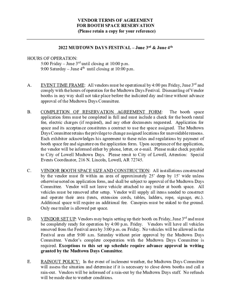 VENDOR TERMS OF AGREEMENT FOR BOOTH SPACE RESERVATION (Please retain a copy for your reference) 2022 MIDTOWN DAYS FESTIVAL June 3rd & June 4th HOURS OF OPERATION: 5:00 Friday, June 3rd until closing