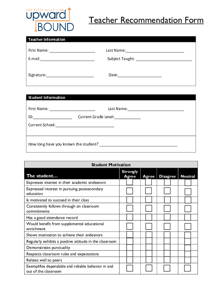 Teacher Recommendation Form Teacher Information First Name: ___ Email:___ Signature:___Last Name:___ Subject Taught: ___ Date:___Student Information First Name: ___ ID:___Last Name:___Current Grade