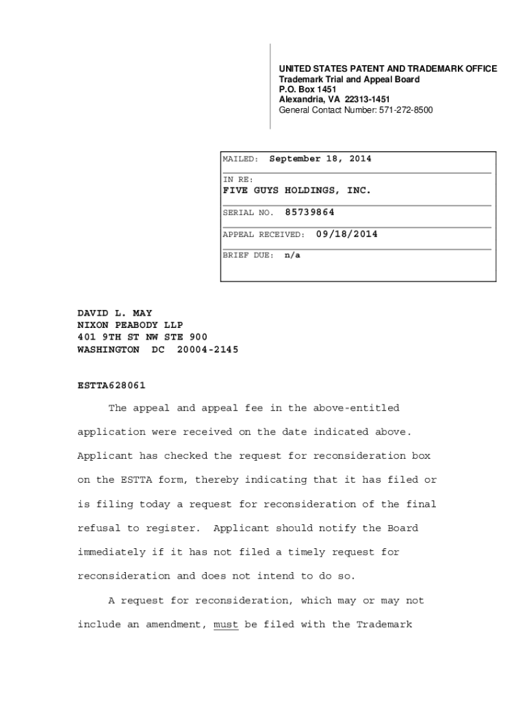 UNITED STATES PATENT AND TRADEMARK OFFICE Trademark Trial and Appeal Board P.O. Box 1451 Alexandria, VA 223131451 General Contact Number: 5712728500MAILED: September 18, 2014 ___ IN RE:FIVE GUYS HOLDINGS,