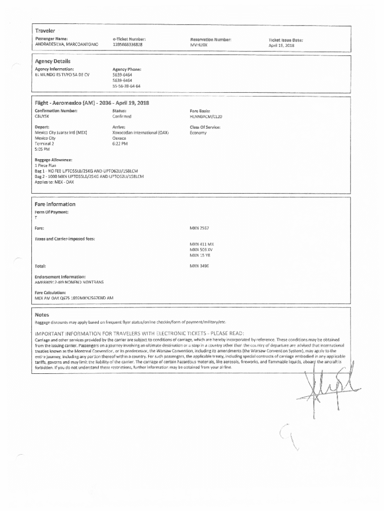 Traveler Passenger Name: ANDRADESILVA, MARCOANTONIOeTicket Number : 1395668336828Reservation Number : MVHU9XTicket issue Date: April 19, 2018Agency Details Agency information: EL MUNDO ES TYO SA DE