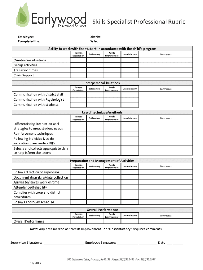 Skills Specialist Professional Rubric Employee: Completed by:District: Date: Ability to work with the student in accordance with the children program Exceeds ExpectationSatisfactoryNeeds ImprovementUnsatisfactoryCommentsUnsatisfactoryCommentsUnsatisfactoryCommentsOnetoone