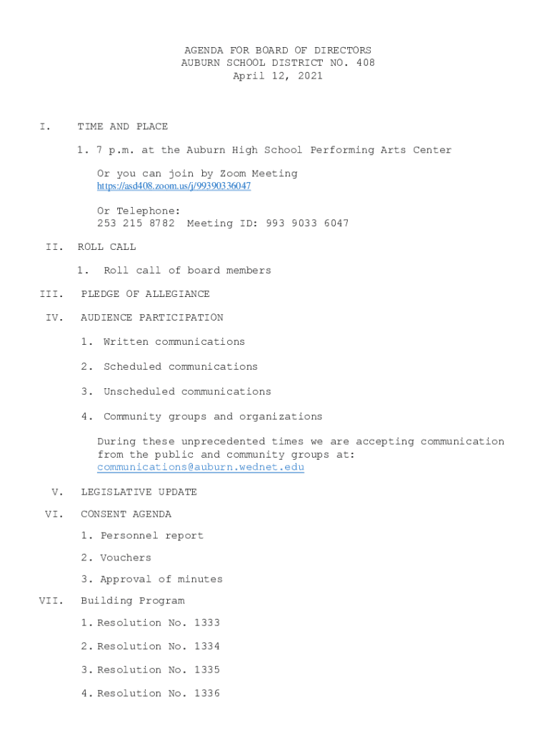 Get the free AGENDA FOR BOARD OF DIRECTORS AUBURN SCHOOL DISTRICT NO. 408 I. TIME ...