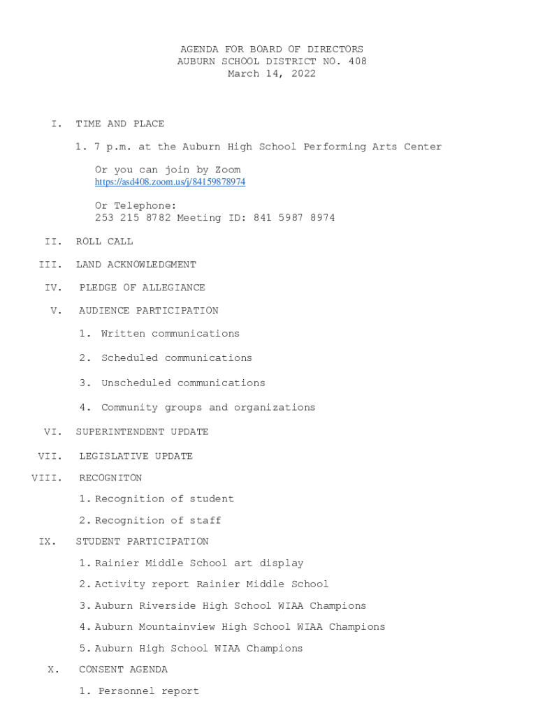Get the free AGENDA FOR BOARD OF DIRECTORS AUBURN SCHOOL DISTRICT NO. 408 Monday ...