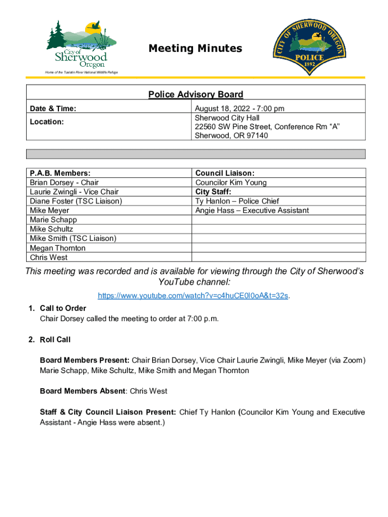 Meeting Minutes Home of the Tualatin River National Wildlife RefugePolice Advisory Board Date & Time:August 18, 2022 7:00 pm Sherwood City Hall 22560 SW Pine Street, Conference Rm A Sherwood, OR 97140Location:P.A.B.