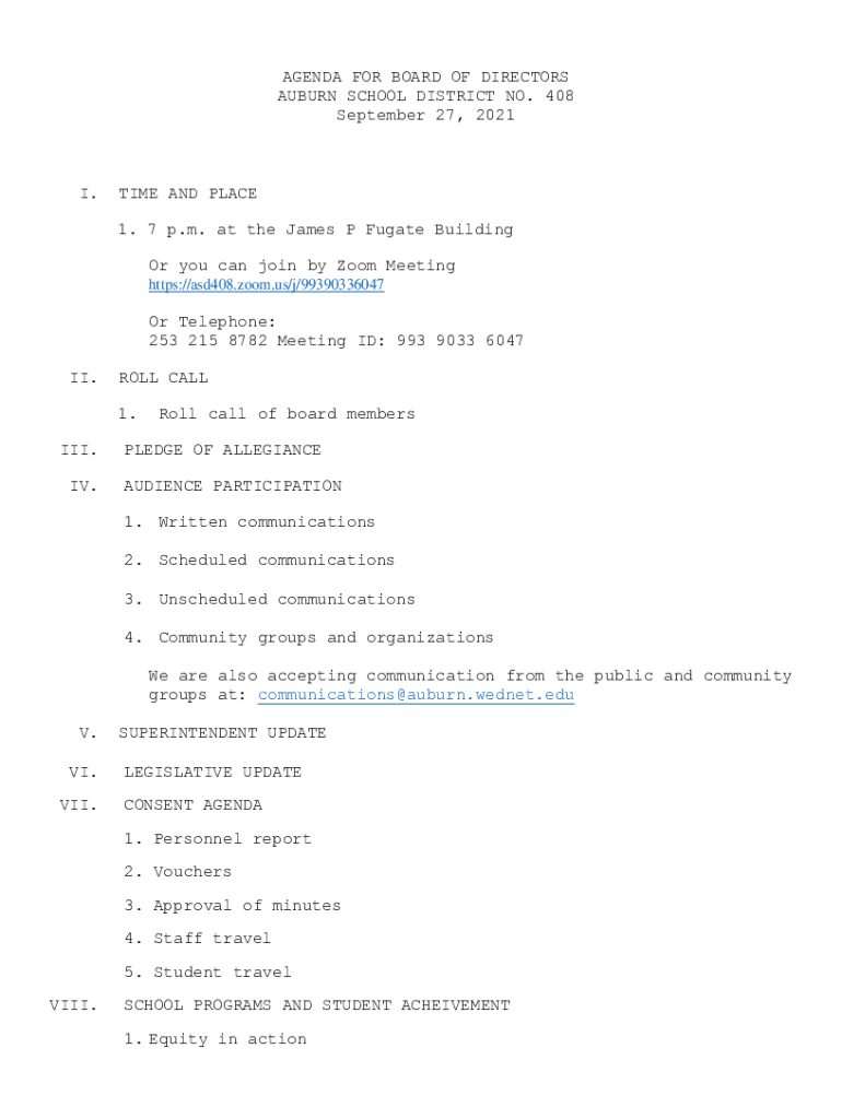 Get the free AGENDA FOR BOARD OF DIRECTORS AUBURN SCHOOL DISTRICT NO. 408 September ...
