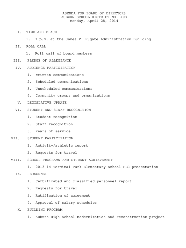 AGENDA FOR BOARD OF DIRECTORS AUBURN SCHOOL DISTRICT NO. 408 Monday, April 28, 2014, I.TIME AND PLACE 1.II.ROLL CALL 1.III. IV. V. VI.VII.VIII. X. Roll call of board membersPLEDGE OF ALLEGIANCE AUDIENCE