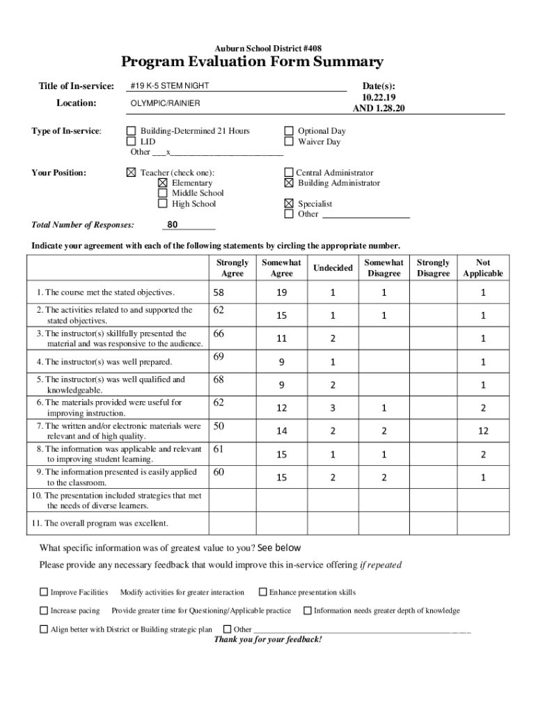 Auburn School District #408Program Evaluation Form Summary Title of In service: Location: Type of In service:Date(s): 10.22.19 AND 1.28.20#19 K5 STEM NIGHT OLYMPIC/RAINIERBuildingDetermined 21 Hours