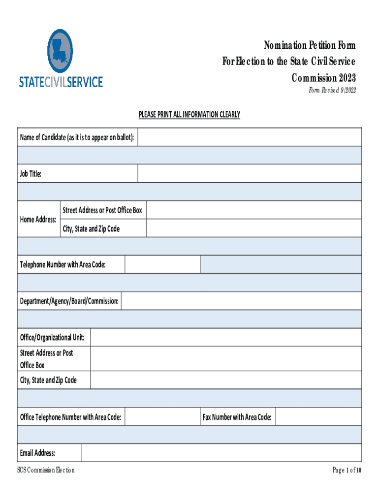 Nomination Petition Form For Election to the State Civil Service Commission 2023 Form Revised 9/2022PLEASE PRINT ALL INFORMATION CLEARLY Name of Candidate (as it is to appear on ballot): Job Title:Home
