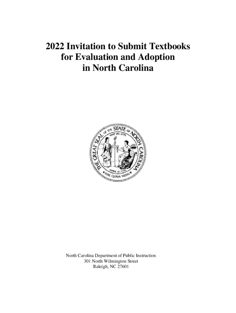 2022 Invitation to Submit Textbooks for Evaluation and Adoption in North Carolina Department of Public Instruction 301 North Wilmington Street Raleigh, NC 276012022 Invitation to Submit Textbooks