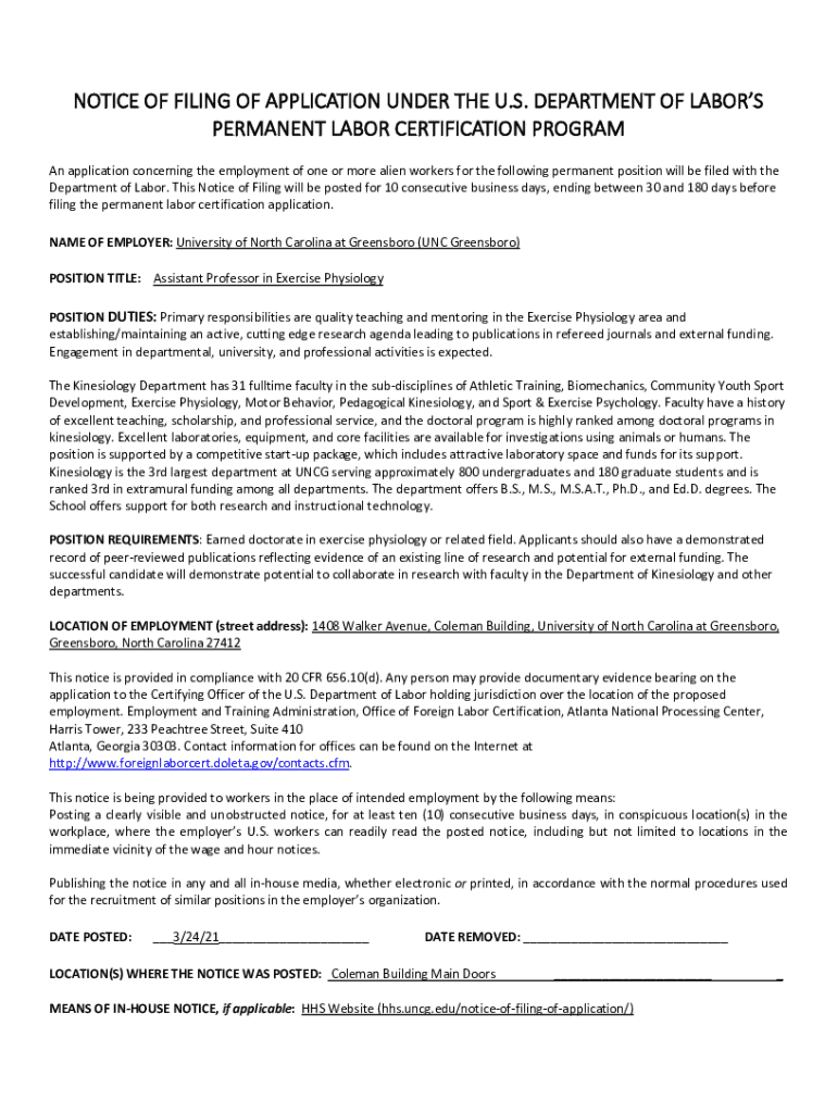 Get the free NOTICE OF FILING OF APPLICATION UNDER THE U.S. DEPARTMENT OF LABORS ... - hhs uncg