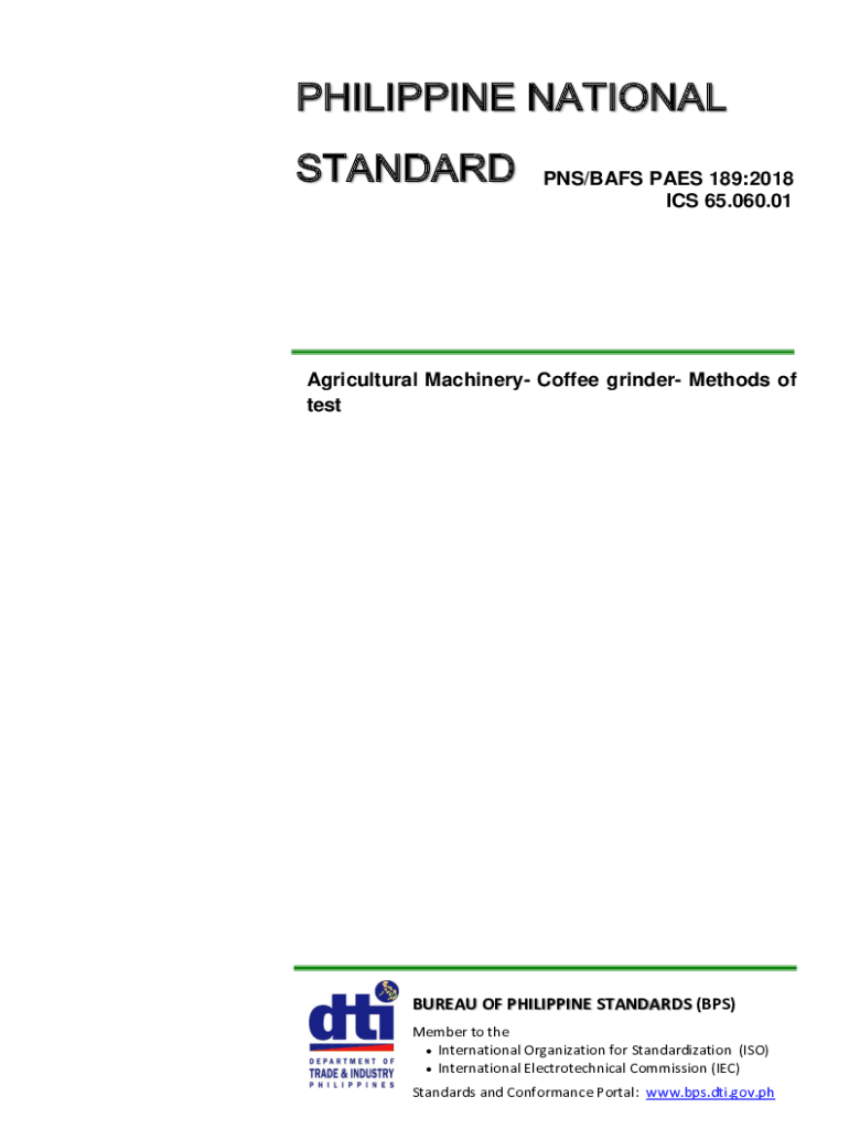 PHILIPPINE NATIONALSTANDARDPNS/BASS PAES 189:2018 ICS 65.060.01Agricultural Machinery Coffee grinder Methods of testBUREAU OF PHILIPPINE STANDARDS (BPS) Member to the International Organization for