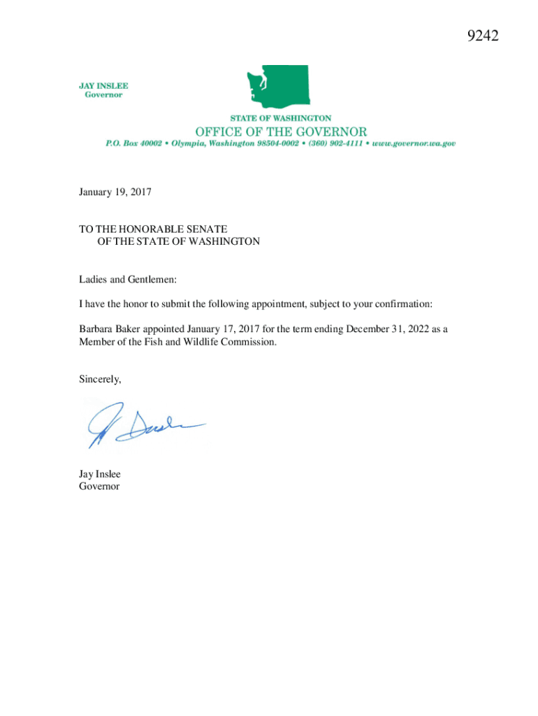 9242January 19, 2017TO THE HONORABLE SENATE OF THE STATE OF WASHINGTONLadies and Gentlemen: I have the honor to submit the following appointment, subject to your confirmation: Barbara Baker appointed