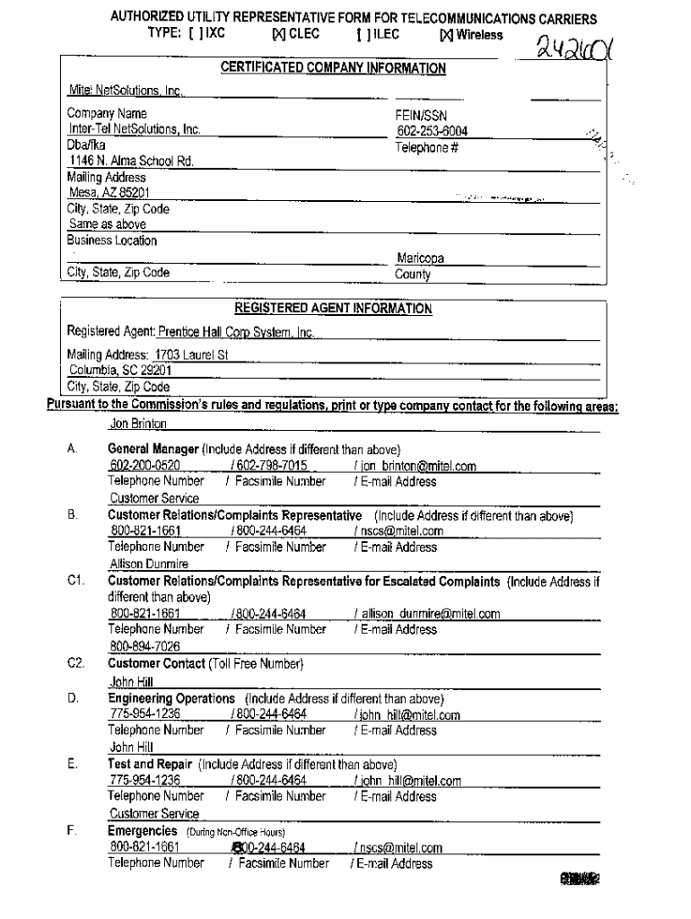 AUTHORIZED UTILITY REPRESENTATIVE AUTHORIZED FORM FOR TELECOMMUNICATIONS CARRIERS REPRESENTATIVE FORM CARRIERS TYPE: [[ ]IXC IX] [[ ]ALEC D(]Wireless _., ... ALEC Wireless [X] ALEC] IXC] [X]CERTIFICATED
