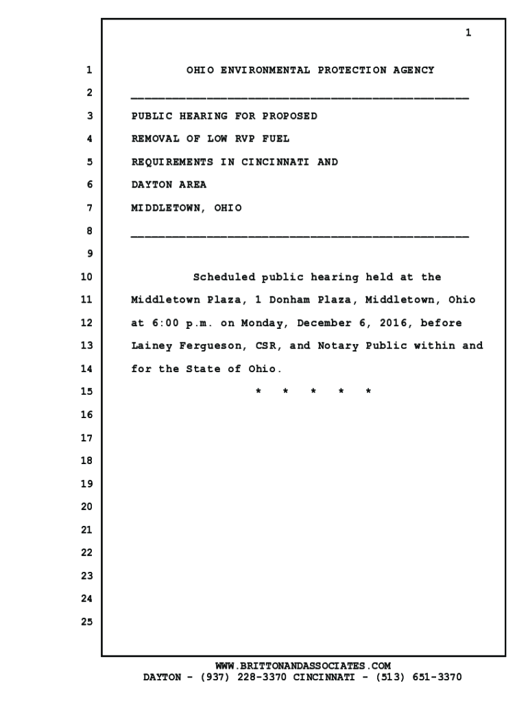 1 1OHIO ENVIRONMENTAL PROTECTION AGENCY2___3PUBLIC HEARING FOR PROPOSED4REMOVAL OF LOW MVP FUEL5REQUIREMENTS IN CINCINNATI AND6DAYTON AREA7MIDDLETOWN, OHIO8___9 10Scheduled public hearing held at