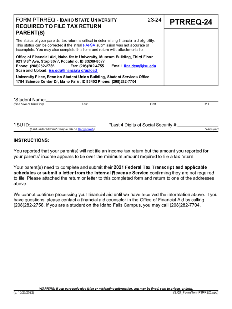 Please fill in blanks, print, sign, attach docs & returnless tab or shift tab to move between fieldwork PURRED IDAHO STATE UNIVERSITY REQUIRED TO FILE TAX RETURN PARENT(S)2324PTRREQ24The status of