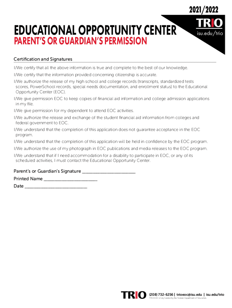 2021/2022EDUCATIONAL OPPORTUNITY CENTERPARENTS OR GUARDIANS PERMISSIONisu.edu/trioCertification and Signatures I/We certify that all the above information is true and complete to the best of our knowledge.