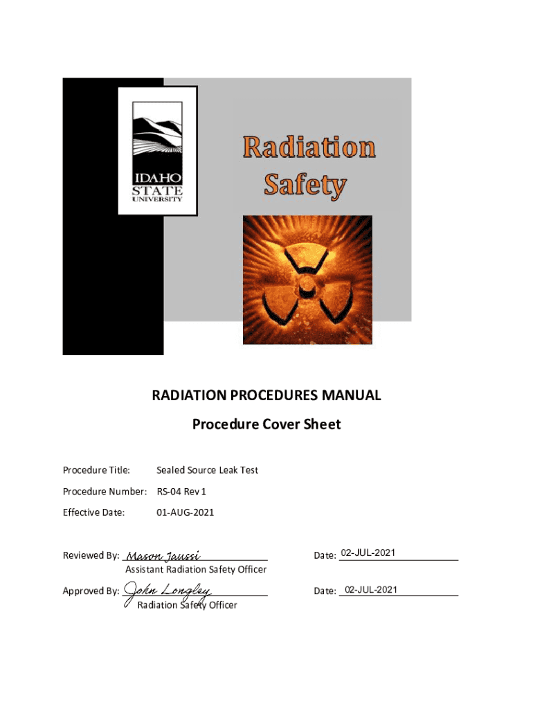 RADIATION PROCEDURES MANUAL Procedure Cover Sheet Procedure Title:Sealed Source Leak Postprocedure Number: RS04 Rev 1 Effective Date:01AUG2021Reviewed By: ___ Assistant Radiation Safety Officer02JUL2021