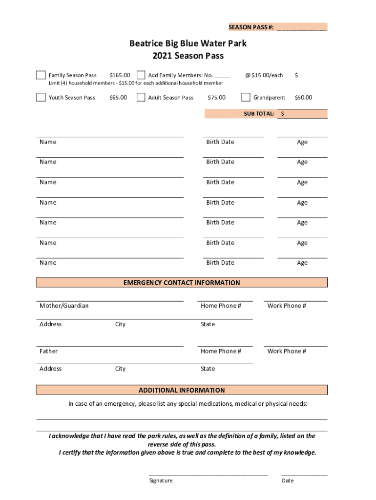 SEASON PASS #: ___Beatrice Big Blue Water Park 2021 Season Pass Family Season Pass$165.00Add Family Members: No. ___@ $15.00/each$Limit (4) household members $15.00 for each additional household memberYouth