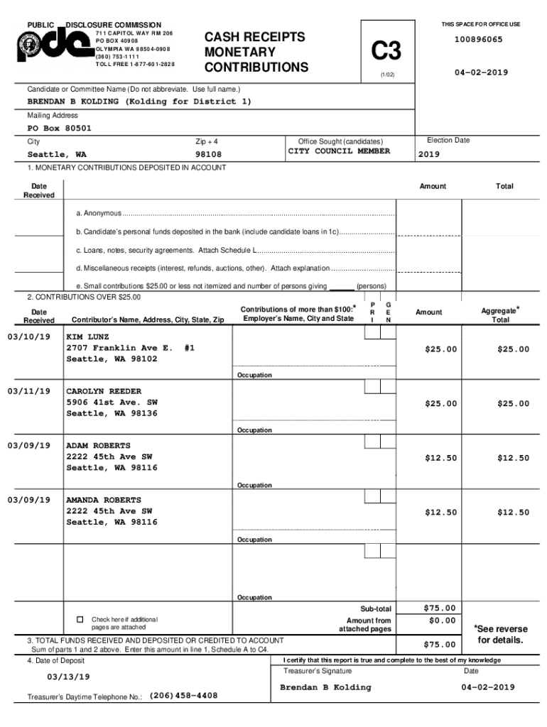 PUBLISHES SPACE FOR OFFICE DISCLOSURE COMMISSION 711 CAPITOL WAY RM 206 PO BOX 40908 OLYMPIA WA 985040908 (360) 7531111 TOLL FREE 18776012828C3CASH RECEIPTS MONETARY CONTRIBUTIONS10089606504022019(1/02)Candidate