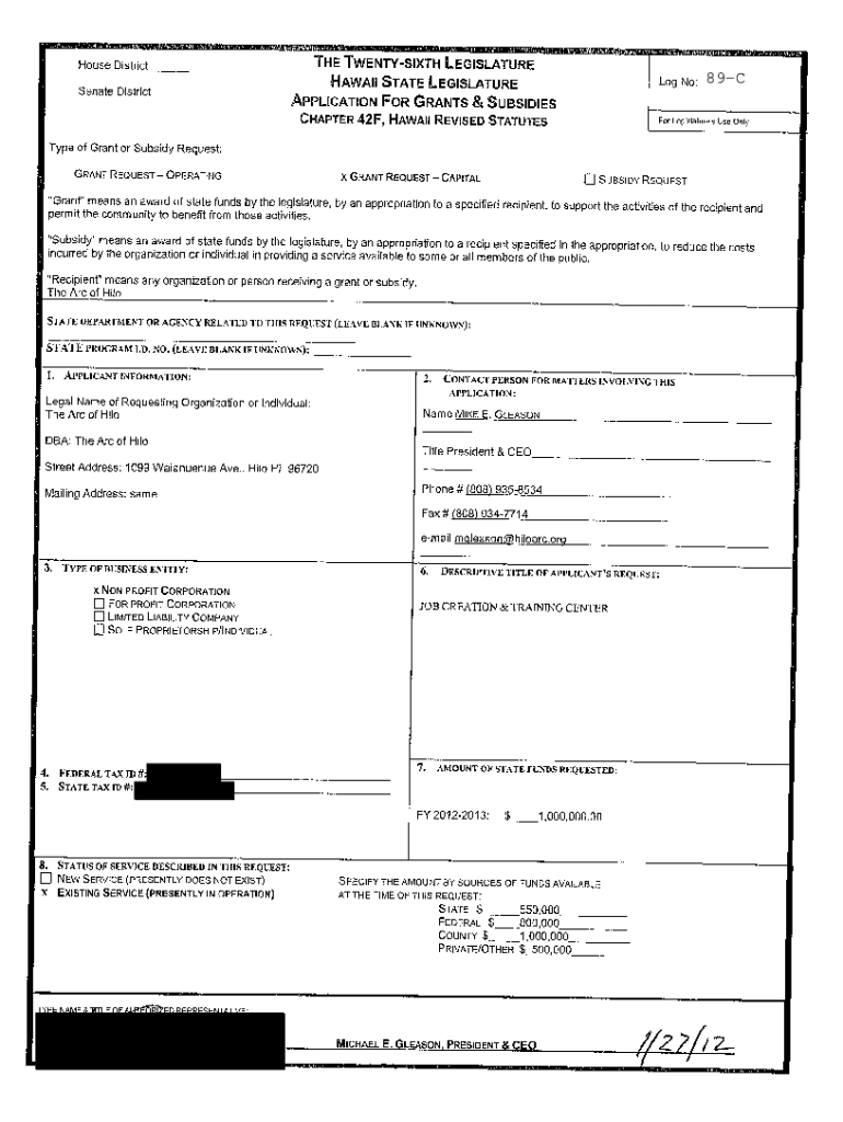 89CApplicant _The Arc of Hilo _ _ _ _ _ _ _ _ _ _ _ __Application for Grants and Subsidies If any item is not applicable to the request, the applicant should enter \” not applicable n.1. Background