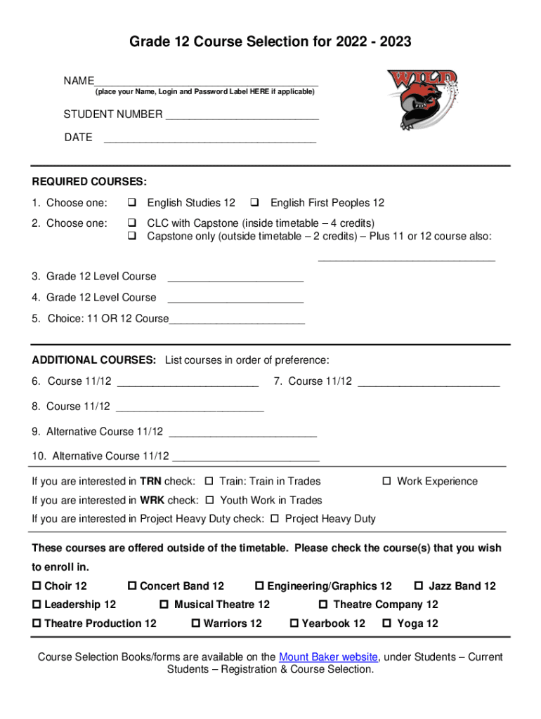 Grade 12 Course Selection for 2022 2023 NAME___ (place your Name, Login and Password Label HERE if applicable)STUDENT NUMBER ___ DATE___REQUIRED COURSES: 1. Choose one: English Studies 12 English