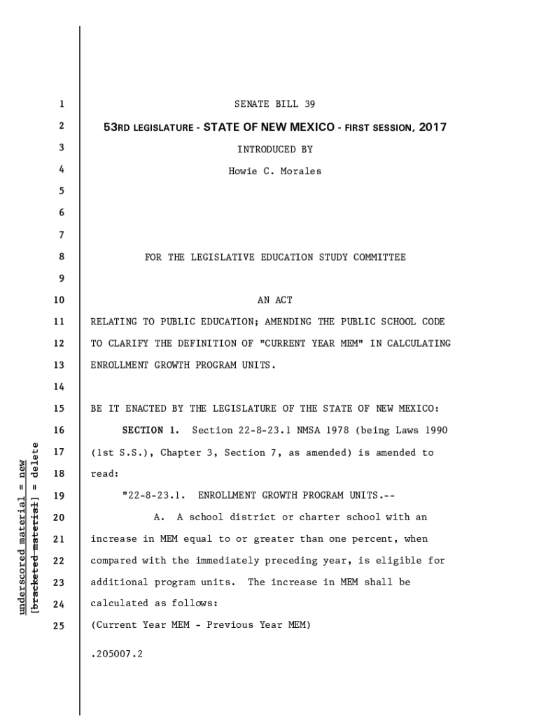 1SENATE BILL 39253RD LEGISLATURE STATE OF NEW MEXICO FIRST SESSION, 20173INTRODUCED BY4Howie C. Morales5 6 7 8FOR THE LEGISLATIVE EDUCATION STUDY COMMITTEE9 10AN ACT11RELATING TO PUBLIC EDUCATION;