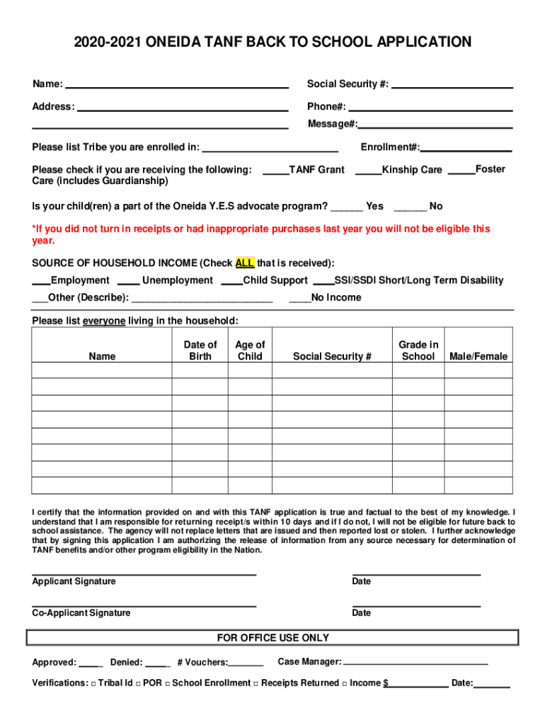 20202021 ONEIDA TANK BACK TO SCHOOL APPLICATION Name:Social Security #:Address:Phone#: Message#: Enrollment#:Please list Tribe you are enrolled in: Please check if you are receiving the following: