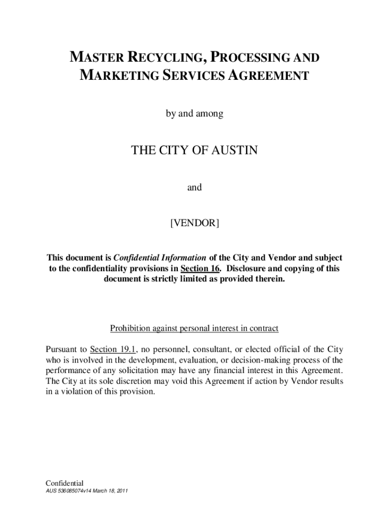 MASTER RECYCLING, PROCESSING AND MARKETING SERVICES AGREEMENT by and among CITY OF AUSTIN and [VENDOR] This document is Confidential Information of the City and Vendor and subject to the confidentiality