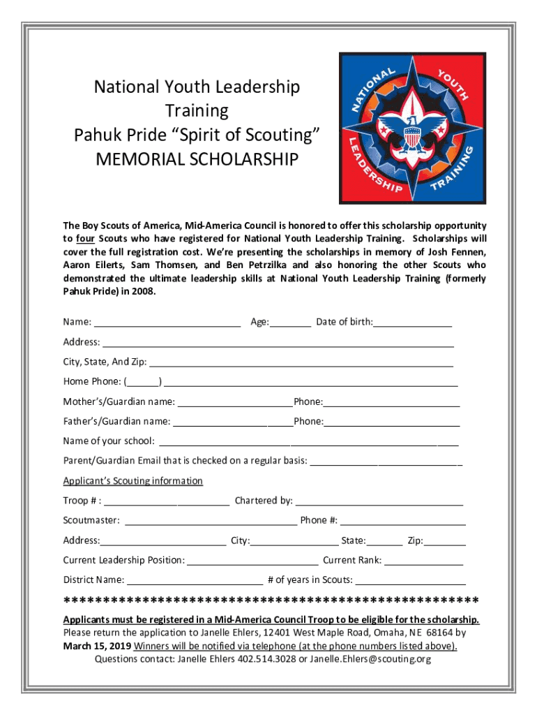 National Youth Leadership Training Park Pride Spirit of Scouting MEMORIAL Scholarship Boy Scouts of America, mid-America Council is honored to offer this scholarship opportunity to four Scouts who