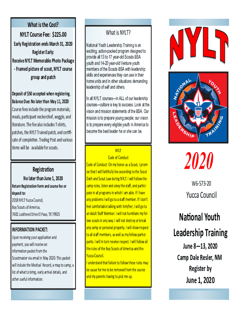 What is the Cost? NY LT Course Fee: $225.00 Early Registration ends March 31, 2020, Register Early: Receive NY LT Memorable Photo Package Framed picture of scout, NY LT course group and patch Deposit