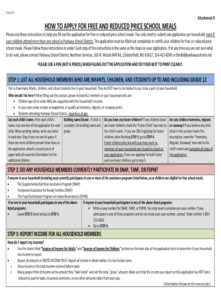 096095Attachment DHOW TO APPLY FOR FREE AND REDUCED PRICE SCHOOL MEALS Please use these instructions to help you fill out the application for free or reduced price school meals. You only need to submit