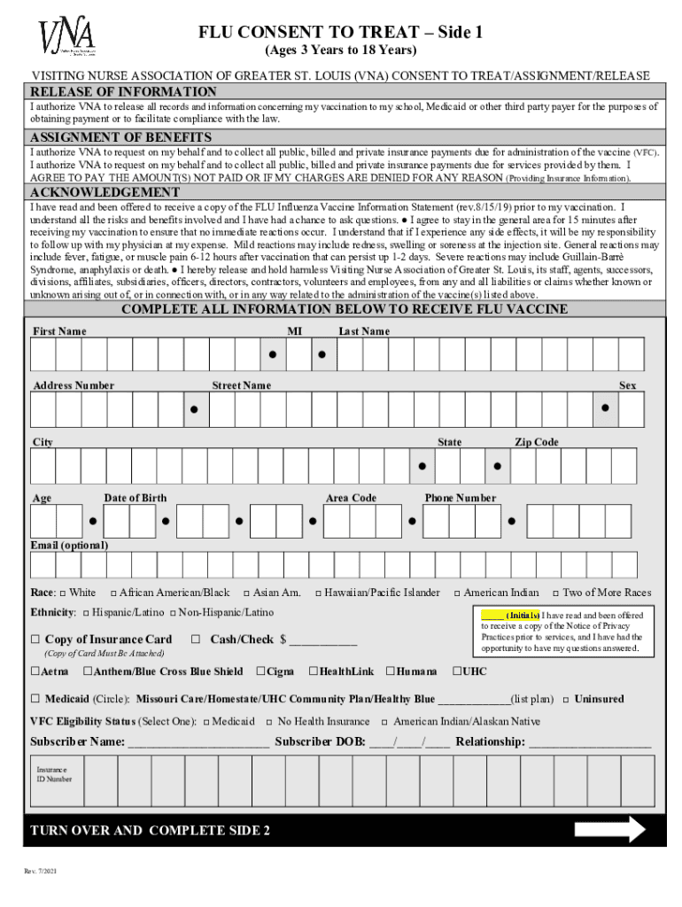 FLU CONSENT TO TREAT Side 1 (Ages 3 Years to 18 Years)VISITING NURSE ASSOCIATION OF GREATER ST. LOUIS (VIA) CONSENT TO TREAT/ASSIGNMENT/RELEASERELEASE OF INFORMATION authorize VIA to release all records