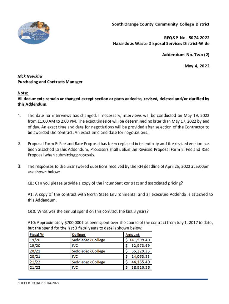 South Orange County Community College District RFP No. 50742022 Hazardous Waste Disposal Services DistrictWide Addendum No. Two (2) May 4, 2022, Nick Newark Purchasing and Contracts Manager Note: