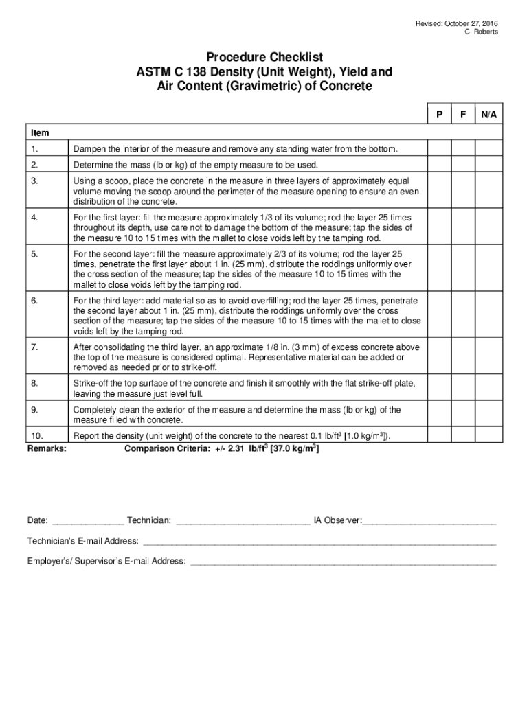Get the free Procedure Checklist ASTM C 138 Density (Unit Weight), Yield and Air ...