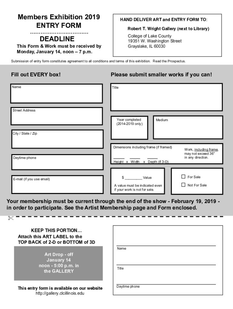 Members Exhibition 2019 ENTRY FOREHAND DELIVER ART and ENTRY FORM TO: Robert T. Wright Gallery (next to Library) College of Lake County 19351 W. Washington Street Grayslake, IL 60030DEADLINEThis Form