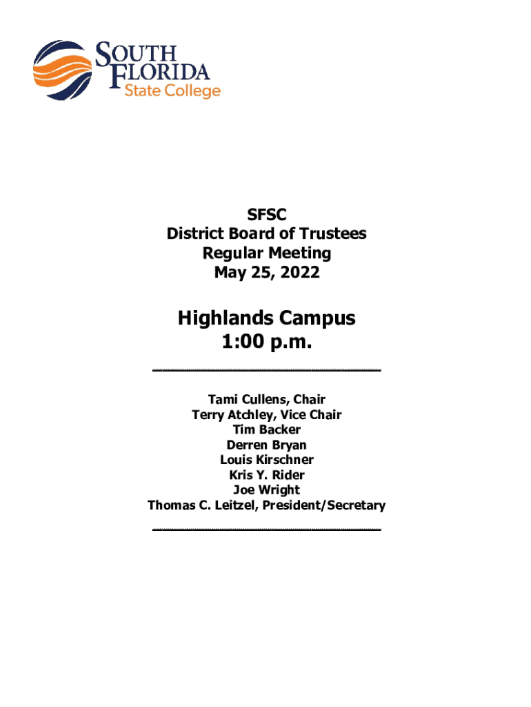 SFC District Board of Trustees Regular Meeting May 25, 2022Highlands Campus 1:00 p.m.___ Tami Cullen's, Chair Terry Ashley, Vice Chair Tim Backer Darren Bryan Louis Kirchner Kris Y. Rider Joe Wright
