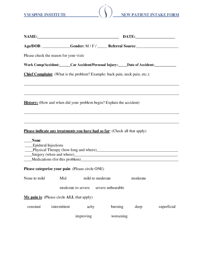 VM SPINE INSTITUTE PATIENT INTAKE FORENAME:___DATE:___Age/DOB: ___Gender: M / F / ___ Referral Source:___ Please check the reason for your visit: Work Comp/Accident:___Car Accident/Personal Injury:___Date