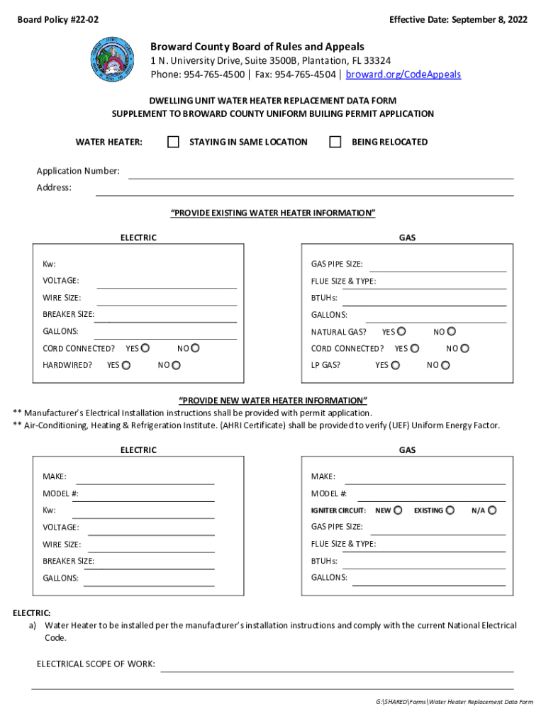 Board Policy #2202Effective Date: September 8, 2022Broward County Board of Rules and Appeals1 N. University Drive, Suite 3500B, Plantation, FL 33324 Phone: 9547654500 Fax: 9547654504 broward.org/CodeAppeals