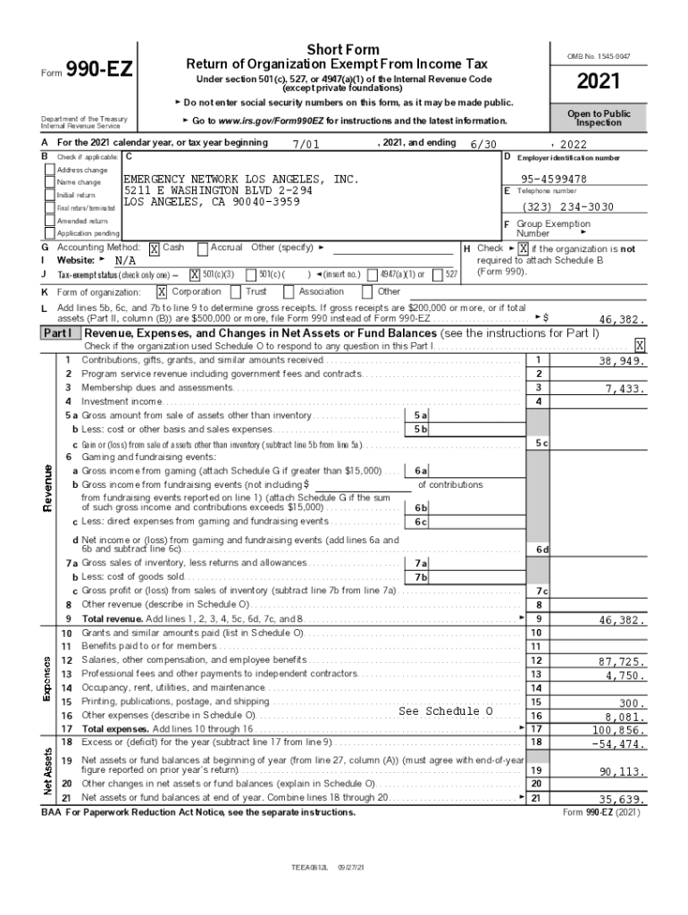 Form Short Form Return of Organization Exempt From Income Tax990EZOMB No. 154500472021Under section 501(c), 527, or 4947(a)(1) of the Internal Revenue Code (except private foundations) G Do not enter