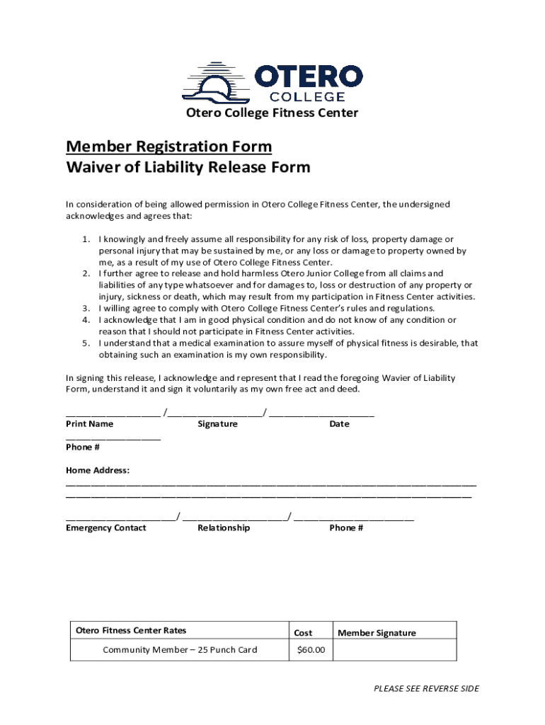 Otero College Fitness CenterMember Registration Form Waiver of Liability Release Form In consideration of being allowed permission in Otero College Fitness Center, the undersigned acknowledges and
