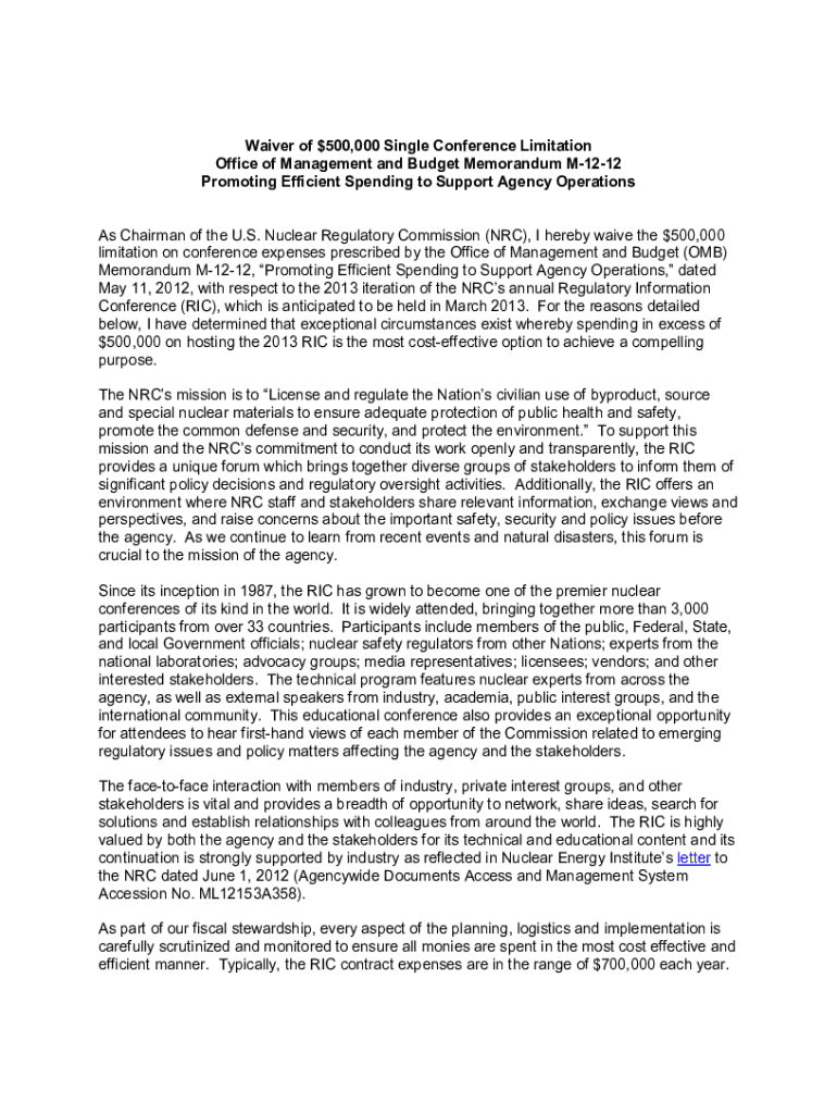 Waiver of $500,000 Single Conference Limitation Office of Management and Budget Memorandum M1212 Promoting Efficient Spending to Support Agency Operations As Chairman of the U.S. Nuclear Regulatory