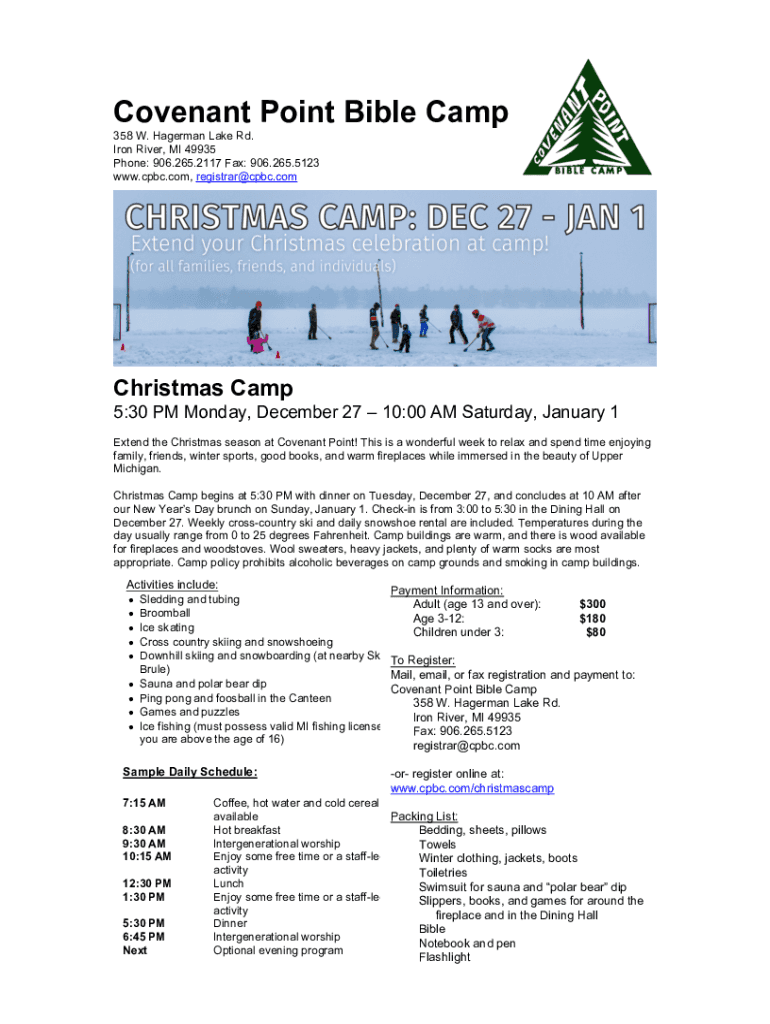 Covenant Point Bible Camp 358 W. German Lake Rd. Iron River, MI 49935 Phone: 906.265.2117 Fax: 906.265.5123 www.cpbc.com, registrar@cpbc.comChristmas Camp 5:30 PM Monday, December 27 10:00 AM Saturday,
