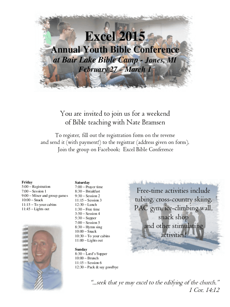 Excel 2015 Annual Youth Bible Conference at Bear Lake Bible Camp Jones, MI February 27 March 1You are invited to join us for a weekend of Bible teaching with Nate Bremen To register, fill out the