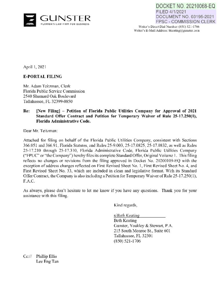 DOCKET NO. 20210068EQ FILED 4/1/2021 DOCUMENT NO. 031952021 FPS COMMISSION CLERK Writer\'s Direct Dial Number: (850) 5211706 Writer\'s Email Address: bkeating@gunster.comApril 1, 2021EPORTAL FILING